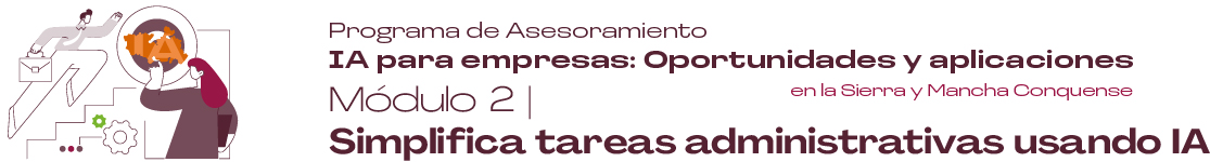 Inicio 5 Programa de Asesoramiento 4 5 Módulo 2: Simplifica tareas administrativas usando IA Volver atrás Módulo 2 Recursos del Módulo Contenido teórico Acceder Podcast Acceder Ejercicio práctico Acceder Lecturas complementarias PCómo Aplicar la IA en tus Tareas Administrativas P8 Procesos que se Pueden Automatizar con IA PImpulsa tu departamento de administración con IA: aumenta eficiencia y reduce costos PLa IA y el futuro del trabajo: tendencias y estadísticas Vídeos complementarios PCómo usar ChatGPT para redactar: Correos y solicitudes - Curso de ChatGPT P¿Qué es la inteligencia artificial? PConvierte Excel en una Herramienta de IA con ChatGPT